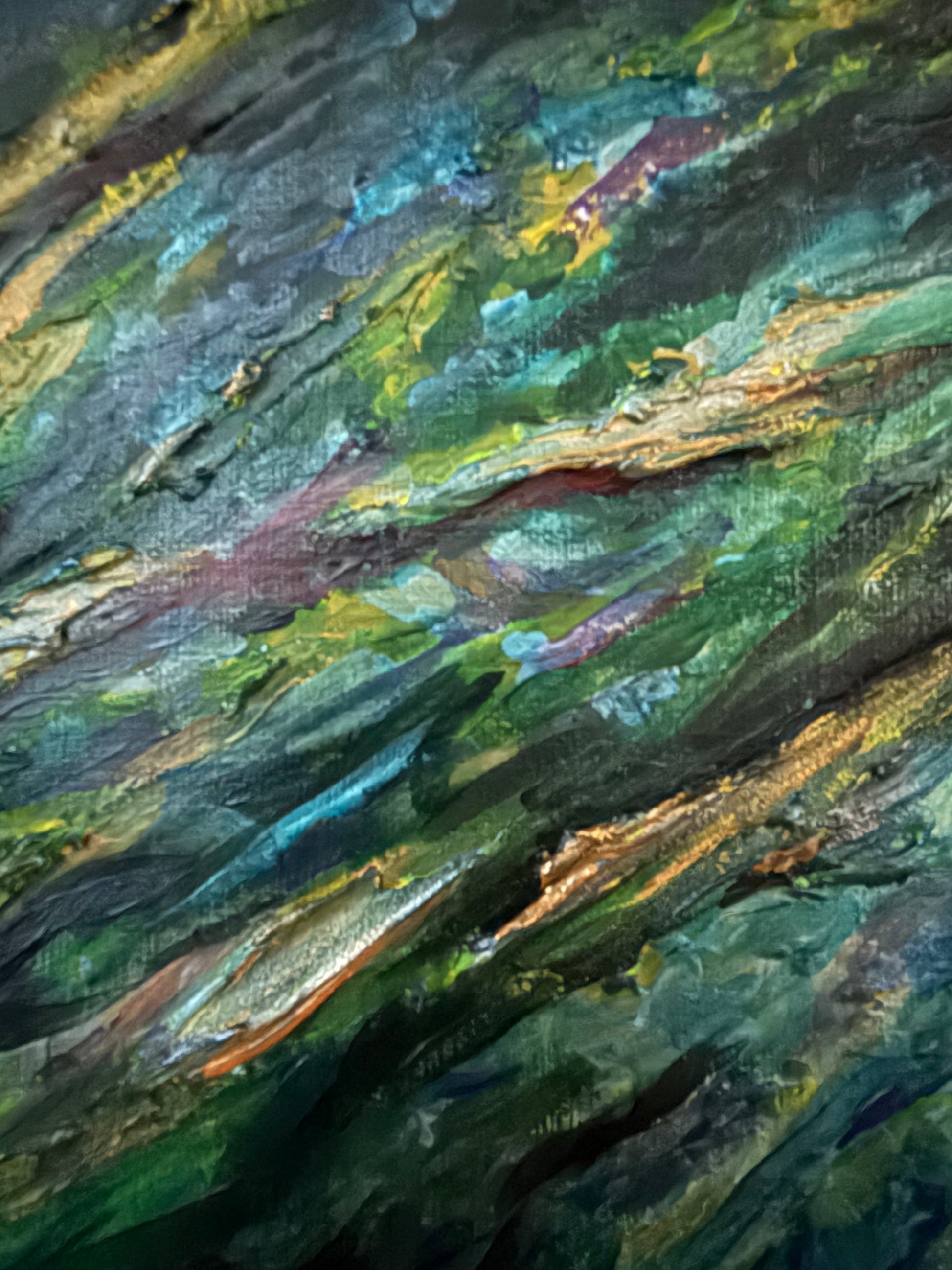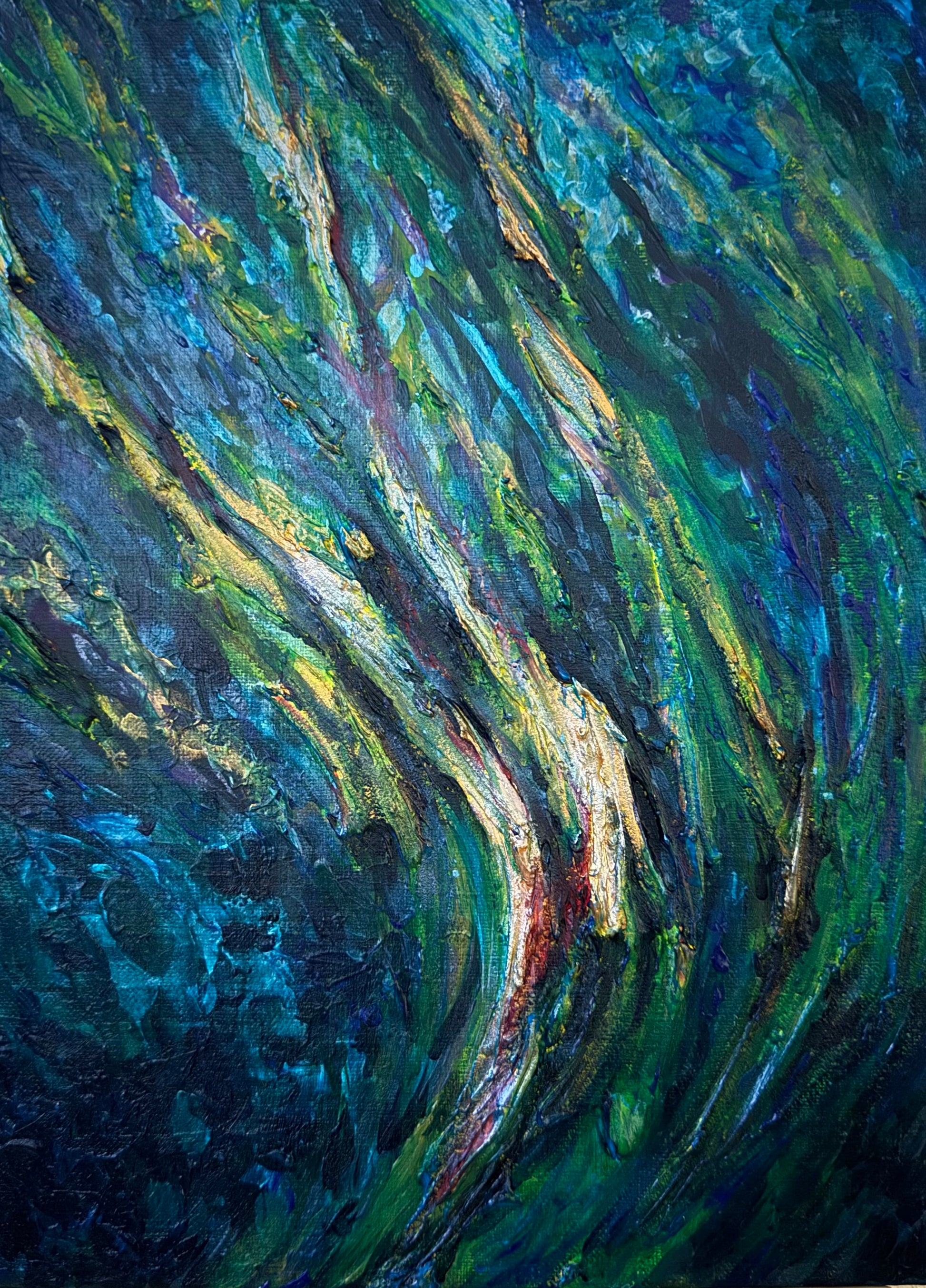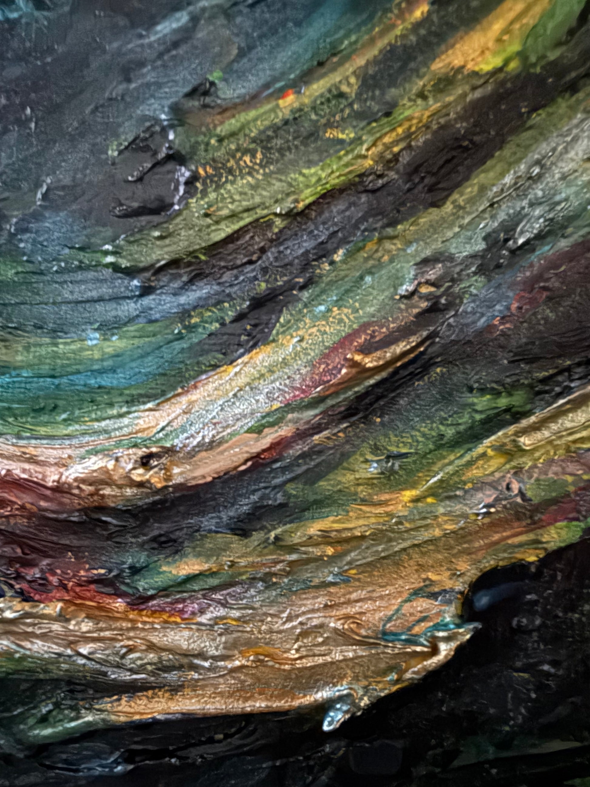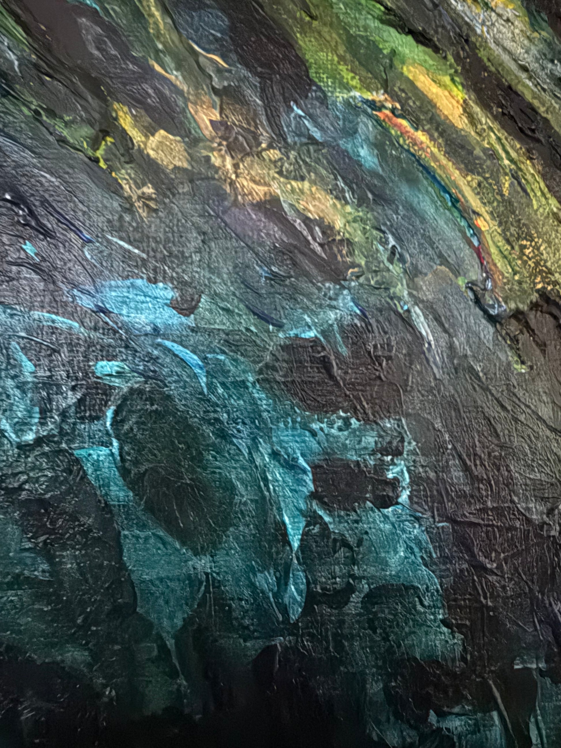 厚く重ねられた絵の具が立体感を生み、光の角度で微妙に色彩が変化。